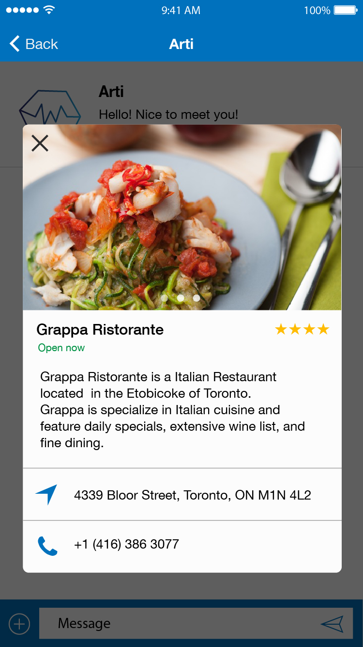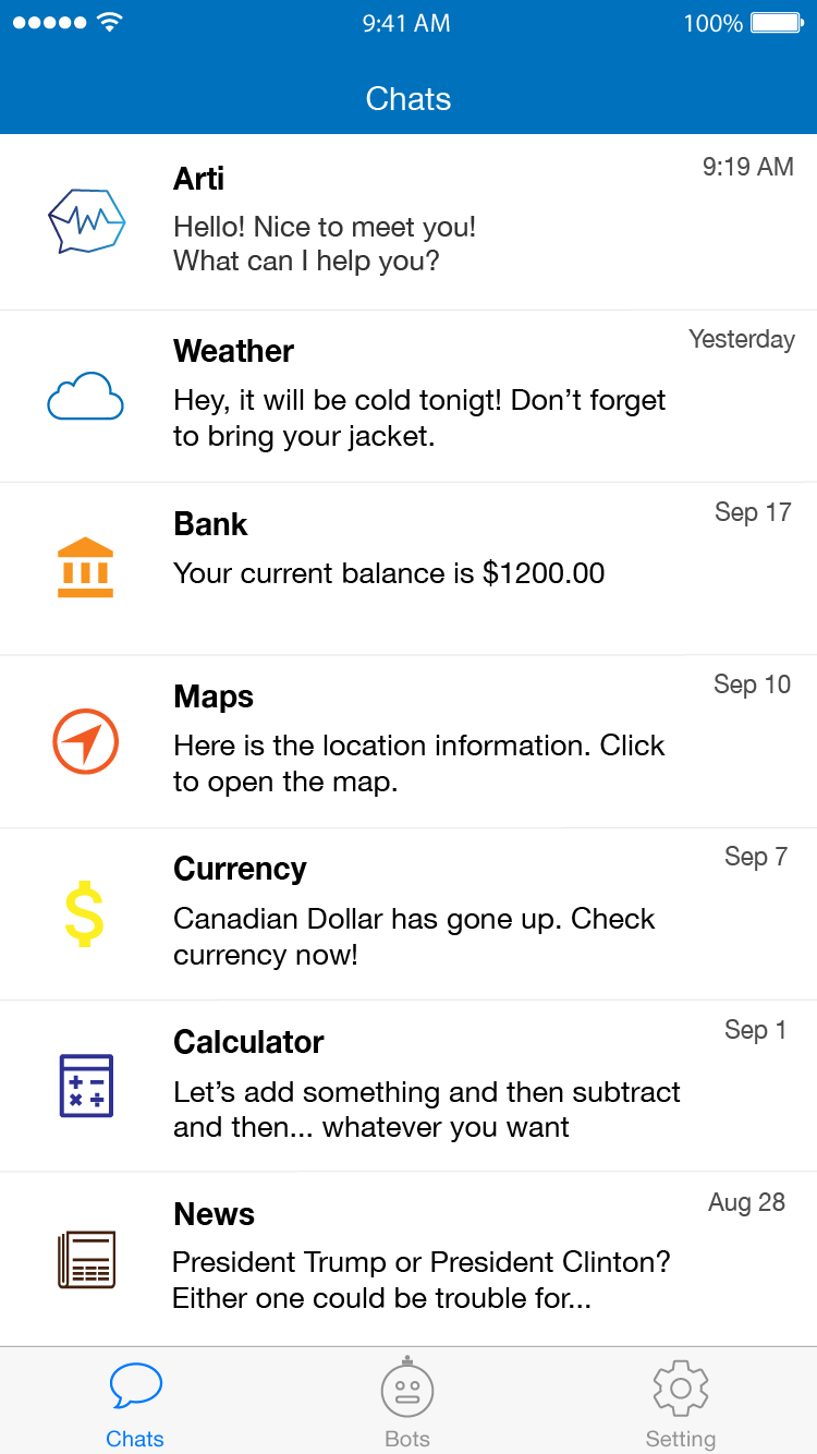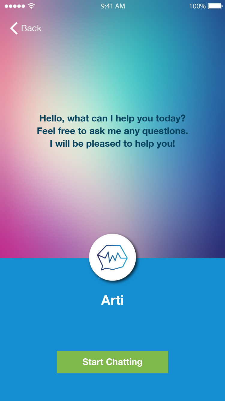 Arti is a chat bot application. Users can ask questions to Arti and Arti will answer the questions and provide information or options according to the questions. Also, Arti has separate categories, so users can use the categorized bots to ask questions or get information.